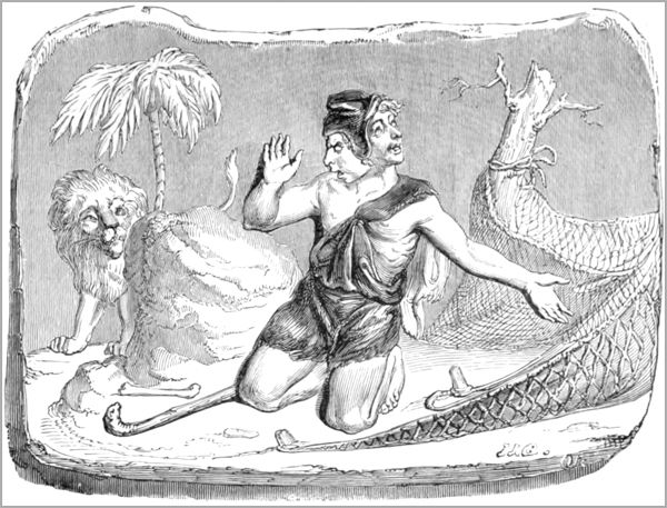 À ces mots sort de l’antre un lion grand et fort ;