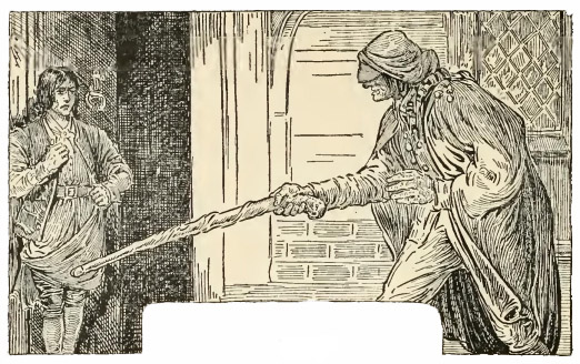 Ce disant, l’inconnu m’attira dans la salle et me plaça derrière lui dans un coin où la porte ouverte nous cachait tous les deux. J’étais fort ennuyé et inquiet, comme bien on pense, et mes craintes s’augmentaient encore de voir l’étranger, lui aussi, visiblement effrayé. Il dégagea la poignée de son coutelas, et en fit jouer la lame dans sa gaine ; et tout le temps que dura notre attente, il ne cessa de ravaler sa salive, comme s’il avait eu, comme on dit, un crapaud dans la gorge.