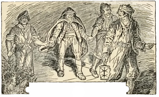 Il éleva le bras en même temps que la voix. Mais à la même minute – pan ! pan ! pan ! – trois coups de mousquet jaillirent du fourré. Merry culbuta dans l’excavation la tête la première ; l’homme au bandage, frappé à mort, giroya comme un toton, s’abattit d’un bloc sur le flanc, et y resta, agité d’une dernière convulsion ; les trois autres firent volte-face et déguerpirent à toutes jambes.