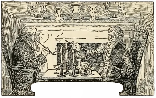 Quand je revins avec le rhum, ils étaient déjà installés de chaque côté de la table servie pour le déjeuner du capitaine : Chien-Noir auprès de la porte, et assis de biais comme pour surveiller d’un œil son vieux copain, et de l’autre, à mon idée, sa ligne de retraite.