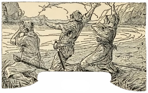 Les trois hommes nous observaient de plus près que nous ne pensions, et nous en eûmes bientôt la preuve. Car en sortant du goulet il nous fallut côtoyer de très près la pointe sud, et ils étaient là tous trois, agenouillés l’un à côté de l’autre sur le sable et nous tendant des mains suppliantes. Nous avions tous le cœur serré, je pense, de les abandonner dans cette triste condition ; mais on ne pouvait risquer une nouvelle mutinerie ; et les ramener chez eux pour les envoyer à la potence eût été un genre de bonté plutôt cruel. Le docteur les héla et leur expliqua où ils trouveraient les provisions laissées pour eux. Mais ils ne cessaient de nous appeler par nos noms, nous suppliant pour l’amour de Dieu d’avoir pitié et de ne pas les abandonner à la mort en un tel lieu.